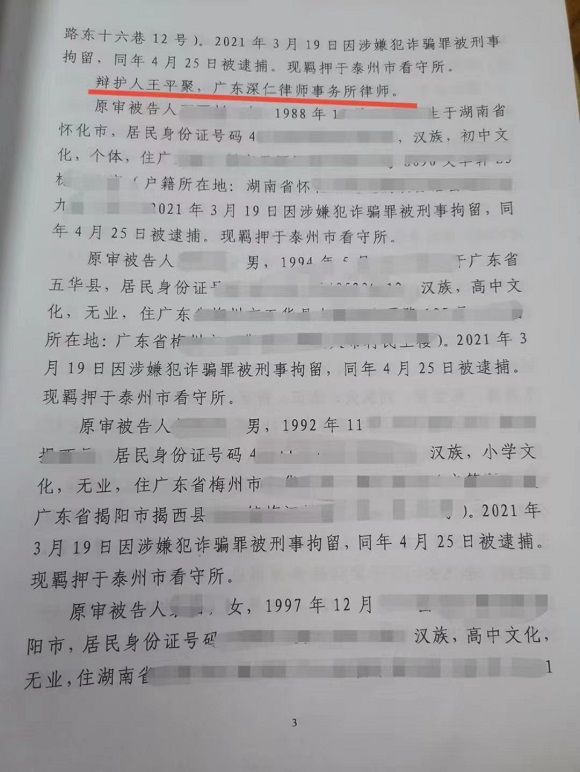 某二十歲小伙誤入電詐團伙被認定為主犯一審判十年,本人二審在江蘇泰州中院爭取開庭改判四年。本人團隊律師也為另外兩位判十年的被告人爭取到改判五年、六年。
